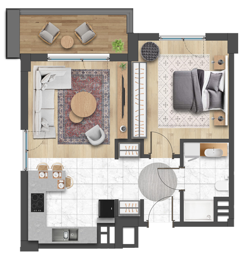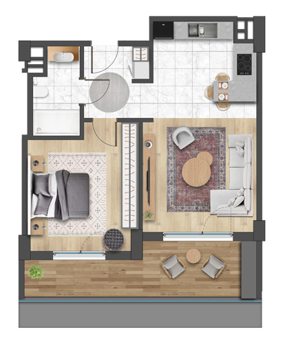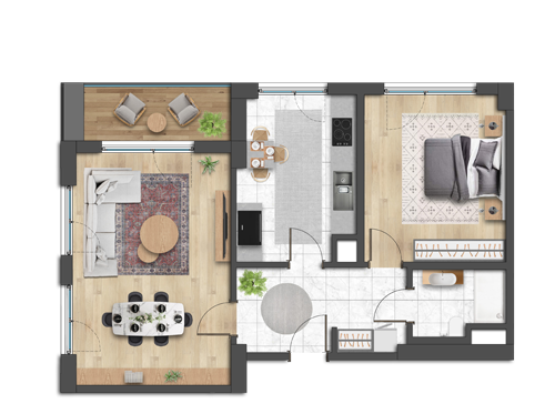 Two-room studio apartments offer a balance of compactness and comfort while also providing a sense of privacy with two separate rooms. It's an ideal option for those who prefer to have a distinct living room and bedroom.
